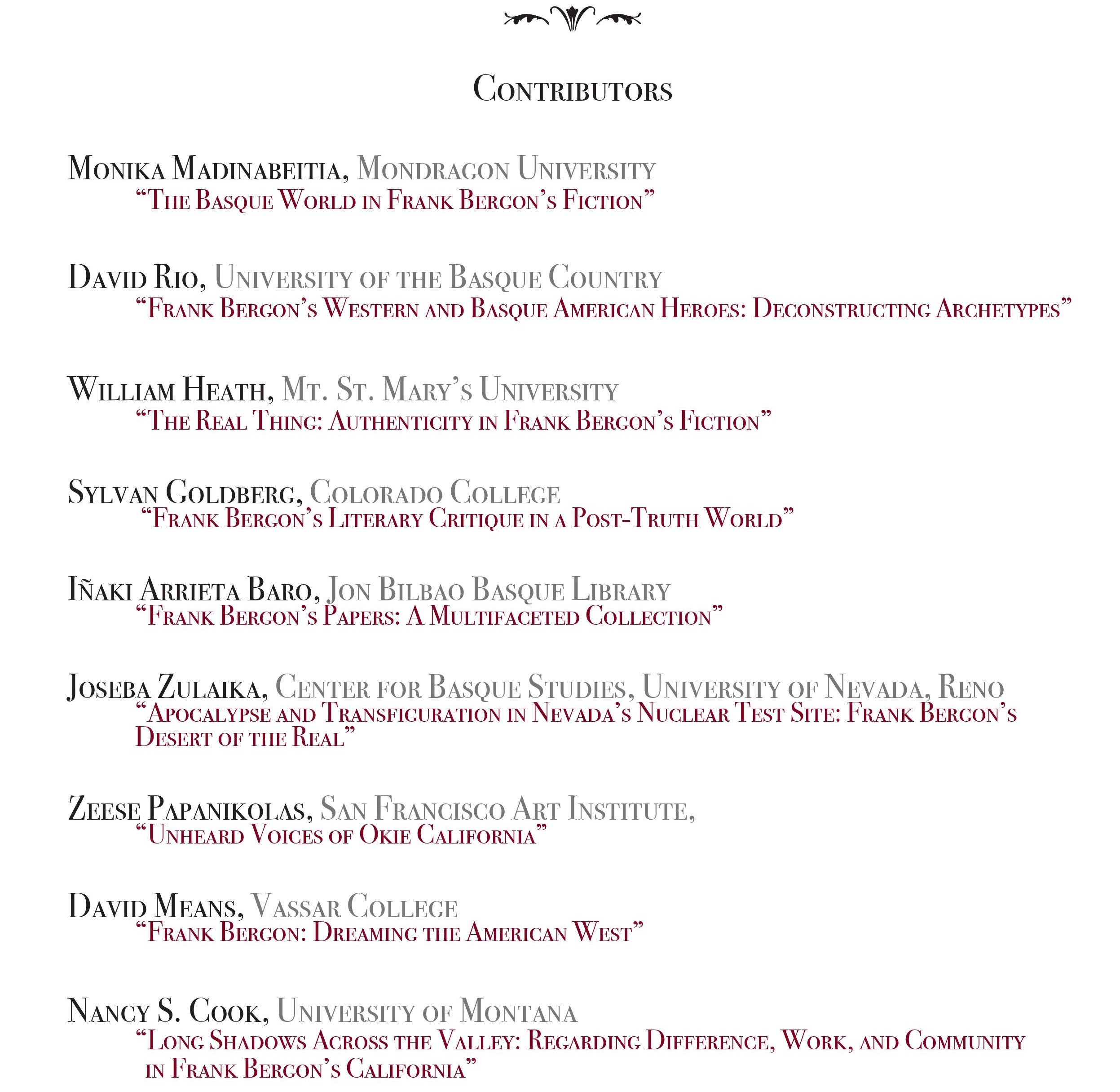 Visions of a Basque American Westerner: International Perspectives on the Writings of Frank Bergon presents the essays of nine scholars and writers from the United States and Europe on the novels, essays, and critical works of Frank Bergon.